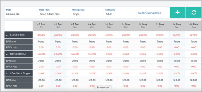 A new rate management screen will be provided. This screen will feature a filter on top for date and rate type. The default view will be with all rate type listed with 15 days rate view and channels the rates are published to. User can easily click a date cell and input/change an existing rate and click and drag that cell across dates to copy same to other selected dates. The concept is based on popular Channel manager rate screens that provide a single view of all rates with edit functionality.
